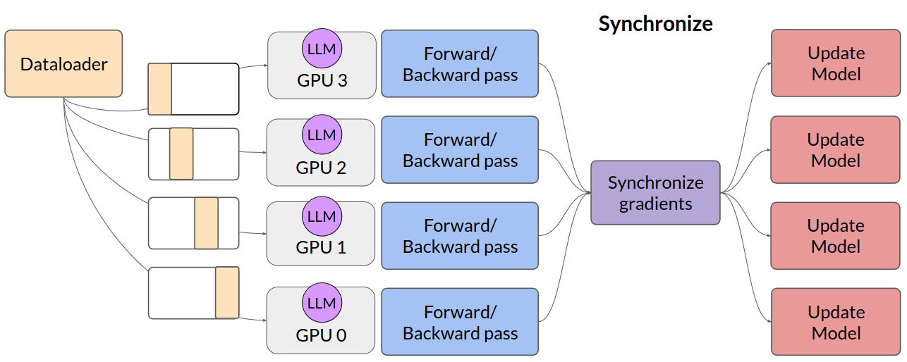 If the model can not fit onto a single GPU, another technique that can be used is model sharding or FSDP. In FSDP each GPU requests data/weights from the other GPUs on demand to materialize the sharded data into unsharded data for the duration of the operation. Then the after the backward pass, the gradients are synchronized across the GPUs in the same way as the DDP.