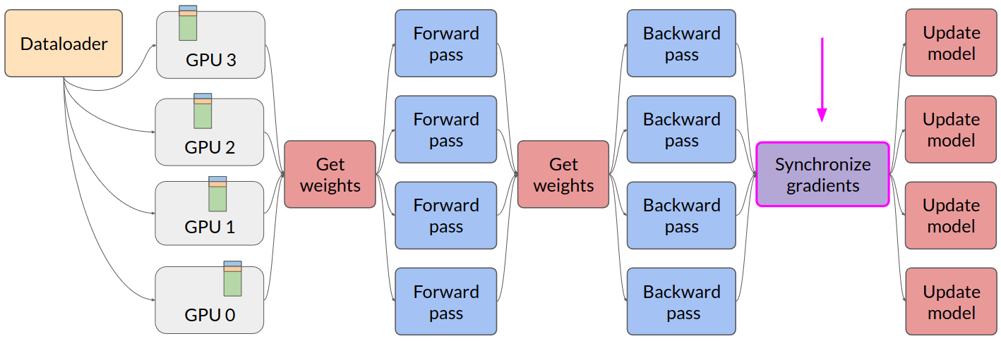 It copies the model into each GPU, and send batches of data to each of the GPUs in parallel. A synchronization step combines the results of each GPU accordingly updating the model on each GPU. Resulting in faster training. NOTE: DDP requires all models weights and all of the additional parameters, gradients, and optimizer states needed for training to fit on a single GPU.