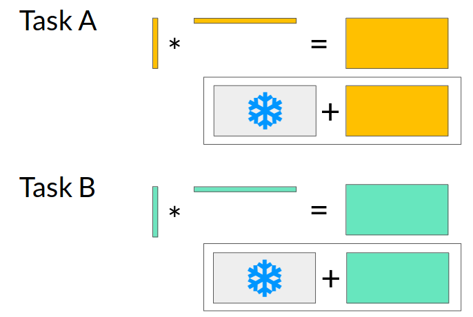 - Inject 2 rank decomposition matrices alongside the original weights.