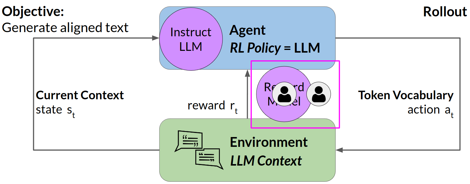 The following figure shows the process of using reinforcement learning to fine-tune LLMs. In this case the agent policy that guides the actions is the LLM, and the main objective is to generate text that is aligned with human preferences. This could mean that the text is helpful, accurate and non-toxic. The environment in this case is the context window of the model. The state the model considers before making an action is the current context (any text in the context window). The action is the act of generating text. The action space is the token vocabulary (all possible tokens the model can choose from to generate text). The series of actions and states is called a rollout.